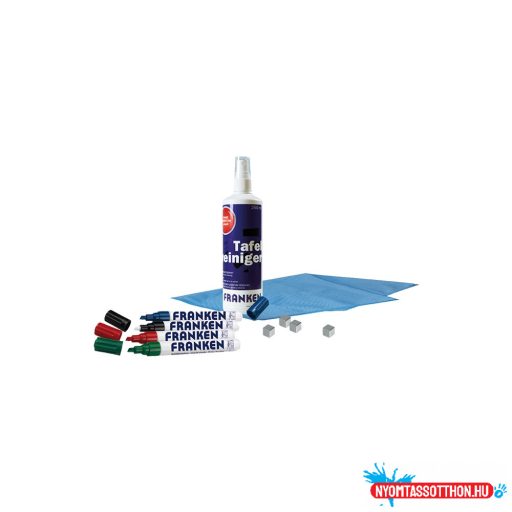 Indulókészlet üvegtáblához. 250 ml tisztító spray, 4 db üvegtábla marker(fekete, kék, piros, zöld), 4 db erős mágnes 10x10x10 mm, mikroszálas törlőkendő kék színben 40x40 cm.