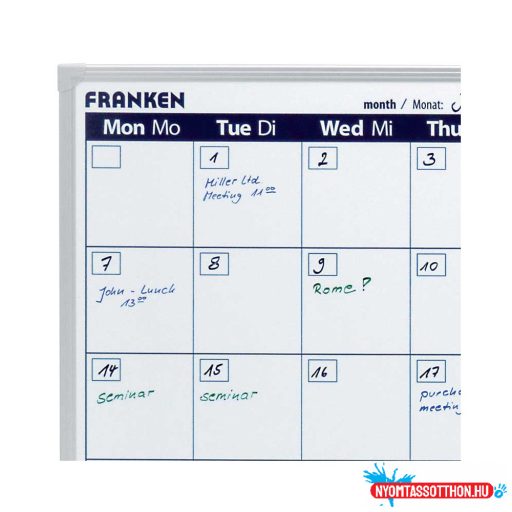 A kiszállított tábla sérülésmentes állapotáról a futár távozása előtt győződjön meg, mert annak állapotáról utólagos reklamációt nem áll módunkban elfogadni, megértésüket köszönjük!Ez a havi tervező megjeleníti az egész hónap tervezését, valamint egy áttekintő oszlopot a következő hónapra is. A feladatok tervezése egy teljes hónapra látható. Egy nap mérete 96 x 98 mm, biztosítja az információk átláthatóságát. Mágneses, írható, szárazon törölhető. Írószertartóval szállítjuk. Katalóguskód: 30782