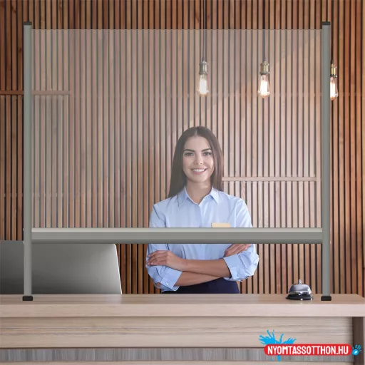 Pult és asztalosztó. Eloxált aluminium keret kereszt tartóval, mely garantálja a stabilitást. Hordozható, 20 cm kivágás az alján a tárgyak, dokumentumok átadásához. Átlátszó, akril edzett üveg, könnyen tisztíható és fertőtleníthető. Teljes magasság: 92,7 cm. Egyszerű, gyors összeszerelés. Méret: 62,9 x 92,7 x 42 cm.