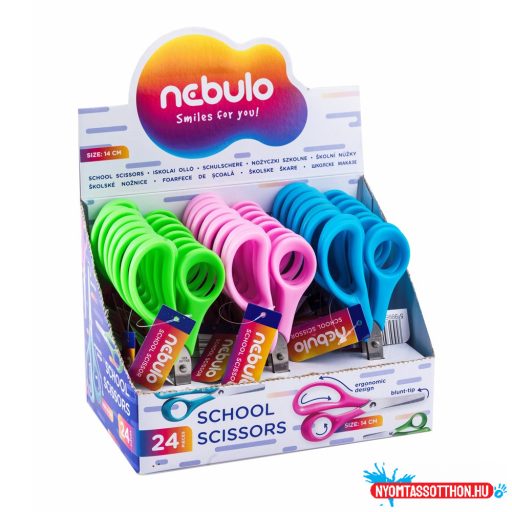A Nebulo 14 cm-es iskolai olló tökéletes választás kisgyermekek és diákok számára. Kerekített hegyének köszönhetően biztonságos, ergonomikus kialakítása pedig kényelmes fogást biztosít. Háromféle színben (zöld, rózsaszín, kék) érhető el, a szín véletlenszerűen kerül küldésre.