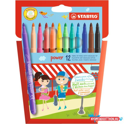 A STABILO power és power max filctollak intenzív színeikkel azon gyerekek számára a legideálisabb, akik néha elfelejtik visszatenni a kupakot. Rendkívül hosszú időre, akár 8 hétig is kupak nélkül hagyható anélkül, hogy kiszáradna! A STABILO power robusztus M-es hegyével (2 mm) tökéletes rajzoláshoz és nagy felületek hatékony kiszínezéséhez, otthon és az iskolában egyaránt. Kimosható tinta.6klt/dob