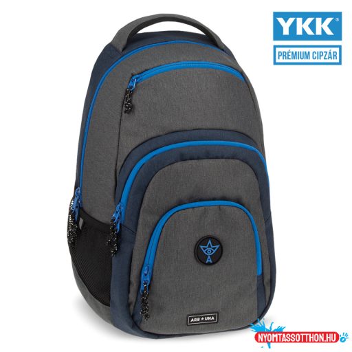 - Szürke hátizsák kék cipzárakkal