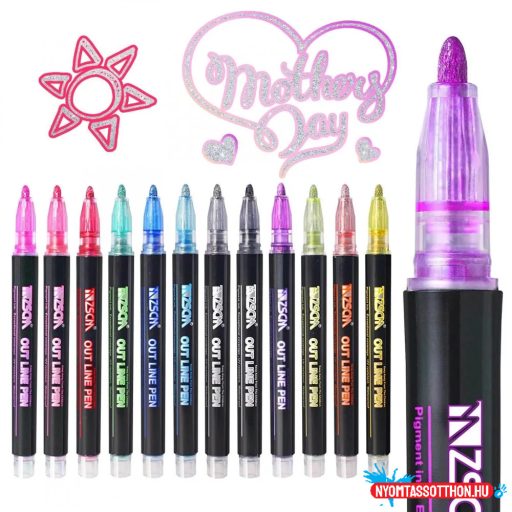 Kontúr filctoll, dupla vonalú, metál szett, csillámos, 12 darabos készlet.