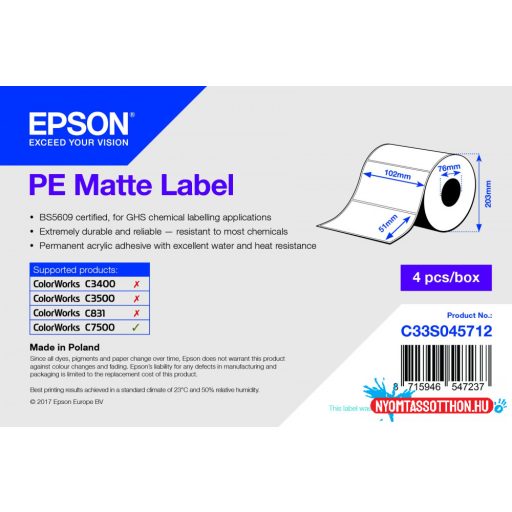 Fehér, matt, tintasugaras szintetikus címke, amely megfelel a GHS vegyszercímkékre vonatkozó BS 5609 szabványnak. Ezekkel a víznek, hőnek és a legtöbb vegyszernek egyaránt ellenálló, PE-alapú címkékkel pontos, beolvasható, elmosódásmentes színes nyomatokat hozhat létre. A vízbázisú akrilragasztó kiváló tapadást és UV-ellenállást biztosít, így hosszan tartó, megbízható, igény szerinti eredményeket nyújt.