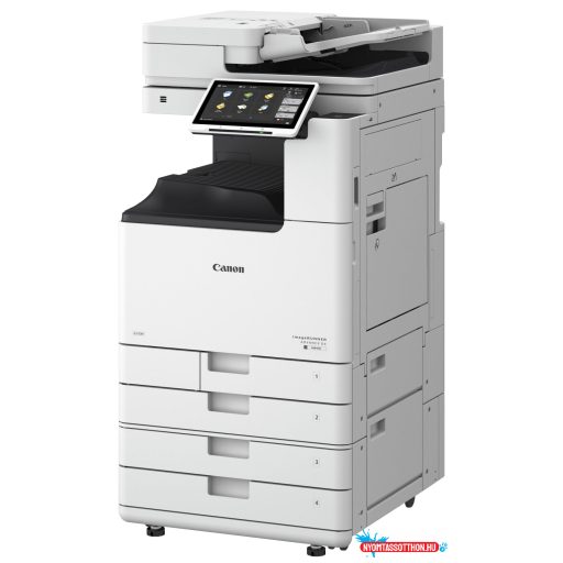**A KÉP CSAK ILLUSZTRÁCIÓ!** *Az ár csak az alapgépre vonatkozik, nem tartalmazza a géptetőt és a gépasztalt! *Kötelezően kell választani hozzá tetőt, lehetőségek: *DADF-BA1 - Kétoldalas beolvasás a többlapos dokumentumok esetében *Single Pass DADF-C1 Egyutas kétoldalas beolvasás a többlapos dokumentumok esetében (DSDF) *Sima tető (Type Y3) - egyetlen dokumentum beolvasásához. *Kötelezően választani kell választani hozzá gépasztalt, lehetőségek: *AW1 kazettás lapadagoló egység (2db 550 lapos kazetta (80g/m2); *S3 gépasztal - Sima gurulós gépasztal, a készüléket felhasználói magasságba emeli további papírkapacitás hozzáadása nélkül. *Nagy teljesítményű, A/3-as méretű mono multifunkciós készülék nagy és színes érintőképernyővel, gyors szkenneléssel és rugalmas csatlakoztathatósággal - az egységes imageRUNNER ADVANCE platformra épülve. Ideális a munkafolyamat-optimalizálásra vágyó, leterhelt irodák számára. * **Műszaki adatok:** *Nyomtatás, másolás, szkennelés, küldés, tárolás és opcionális fax funkció *35 lap/perc sebesség *10,1 hüvelykes TFT LCD WSVGA színes érintőpanel *Memória: 3,5 GB RAM *Tárhely: 256 GB SSD (opcionális: 1TB SSD) *Hálózat: *Normál:1000Base-/100Base-TX/10Base-T *1 db USB 2.0 (host) port, 1 db USB 3.0 (host) port, 1 db USB 2.0 (eszköz) port *2x550 lapos papírkazetta és 100 lapos többfunkciós tálca *Papírsúly: 52g-256 g/m2 *Zoom: 25%-400% között *beépített UniFLOW *nagy sebességű és nagy pontosságú szkennelés *E-mail, FTP, SMB 3.1.1 szkenner (TIFF, JPEG, PDF) *Kelléke: Canon C-EXV66 Toner Black (44.500 oldal kapacitás) - **INDULÓ TONERT NEM TARTALMAZ A KÉSZÜLÉK! *Garancia: 1 év - CSAK CANON MÁRKASZERVIZ ÁLTAL BEÜZEMELT KÉSZÜLÉKRE! *A már beüzemelt készülék csak személyes átvétellel vásárolható meg!** *További információért hívja kereskedőjét!