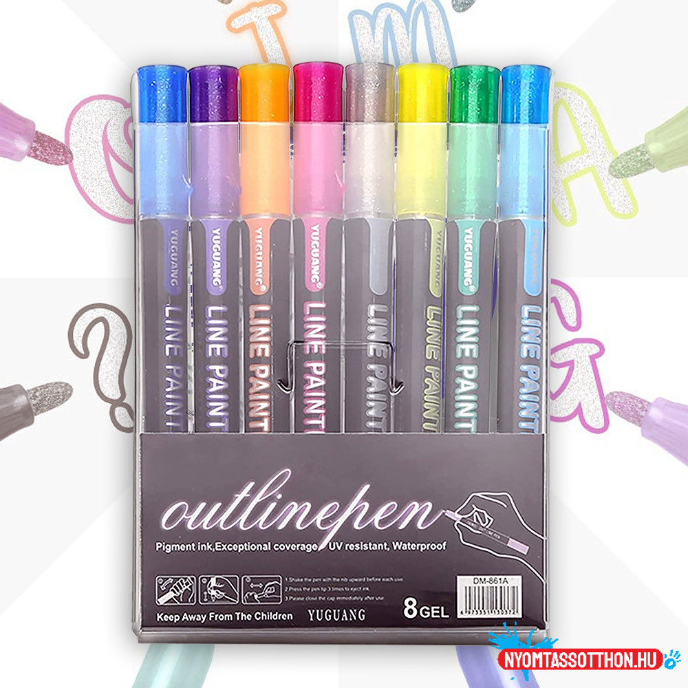 A Kontúrfilc készlet - 8 Gel Outlinepen - Vízálló egy kiváló minőségű filckészlet, amely ideális választás a precíz munkákhoz és kreatív projektekhez. A készlet 8 különböző színű filctollat tartalmaz, mindegyik vízálló, így tartós és élénk kontúrokat hozhatsz létre papíron, műanyagon, fémfelületen vagy üvegen. A gélszáras filcek könnyen használhatóak és gyorsan száradnak, így a színek intenzitása hosszú ideig megmarad.