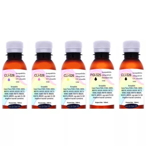 <100ml CLI-526 Cyan - dye-based ink <100ml CLI-526 Magenta - dye-based ink <100ml CLI-526 Yellow - dye-based ink <100ml CLI-526 Black - dye based ink 100ml PGI-525 Black - Real Pigment Ink! span> users in the long run are satisfied with the inks they use. General aftermarket inks usually do not boast of color fidelity (greyish or greenish prints), grains, striped prints and damage to the print head, and do not tolerate the simple inks of sunlight, fading quickly, fading. ANTI-UV Ink is a special UV resistant ink that is uniquely marketed in Hungary for printers. The color of the ink is vivid and the print head has no harmful effects. In addition, it is more resistant to sunlight than an average aftermarket ink. If you want a longer print, look for a pigment-based printer. UV resistant ink loses its sharpness over time due to its water-based composition, but produces longer-lasting prints than the average aftermarket inks available on the market. For long-lasting durability, use high-quality photo paper or protect the print from direct sunlight. Protecting your prints is recommended for all inkjet prints, whether you are using original ink or aftermarket (photo album, foil, etc.). However, be careful if the ink gets on your skin, you can not wash it off easily (always use gloves). Documents, charts, illustrations, photos, portraits, posters, photo albums, marketing materials, etc. suitable for high quality printing. For indoor use. We recommend replacing it in the set. Overall: